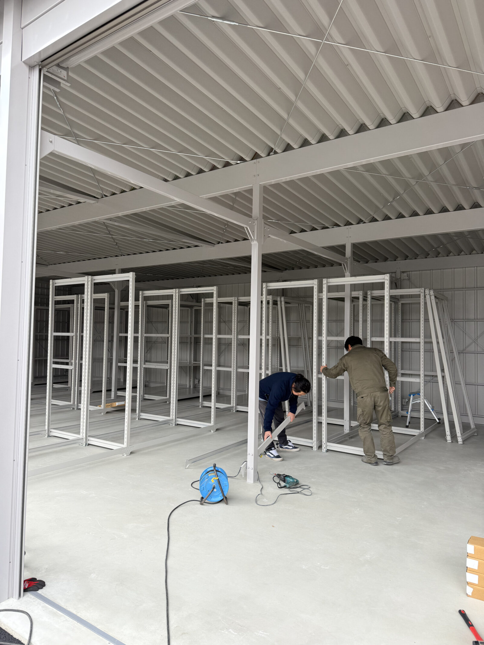 防災備蓄倉庫にて、大型ラックの組立・設置を行いました。