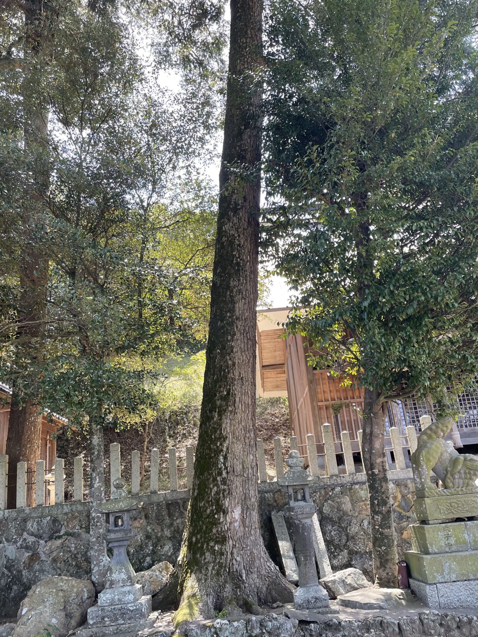 本殿の前には、ご神木となる大モミ(モミ、樹高32m、幹回り3.1m)が立っていますが、度重なる台風や豪雨、さらには枝付きのアンバランスさにより、徐々に本殿に向かって傾いてきています。