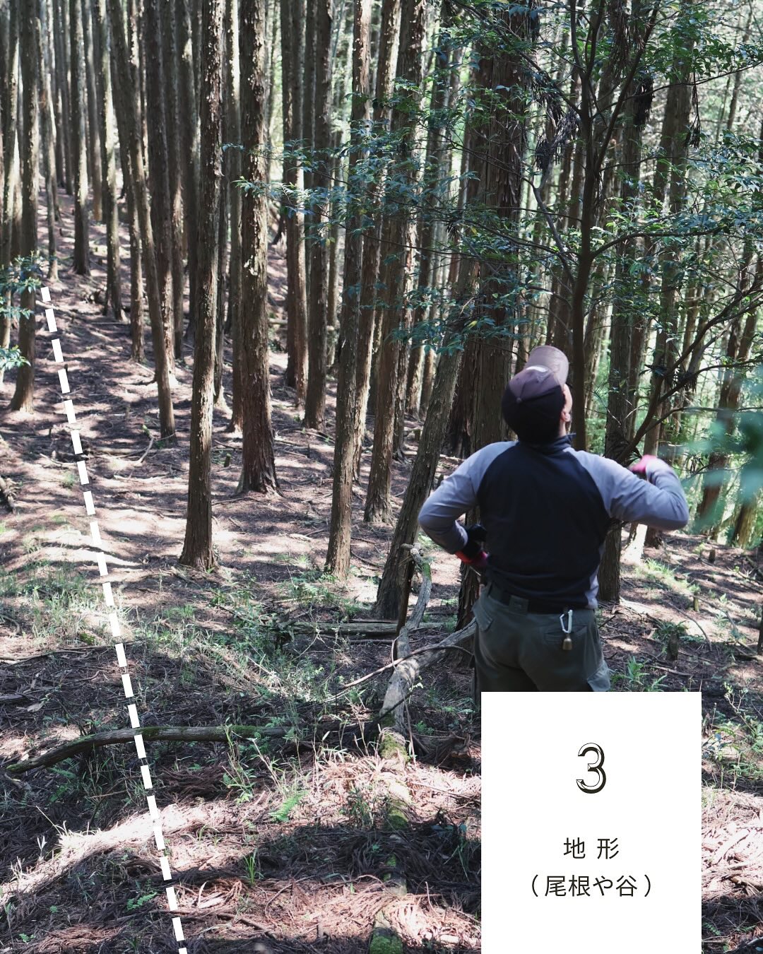 尾根や谷を境に、植え方や手入れの仕方が変わることがあり、それが山主さまの判別につながる場合もあります。同じ人工林でも、管理の違いによって山の雰囲気は大きく変わります。